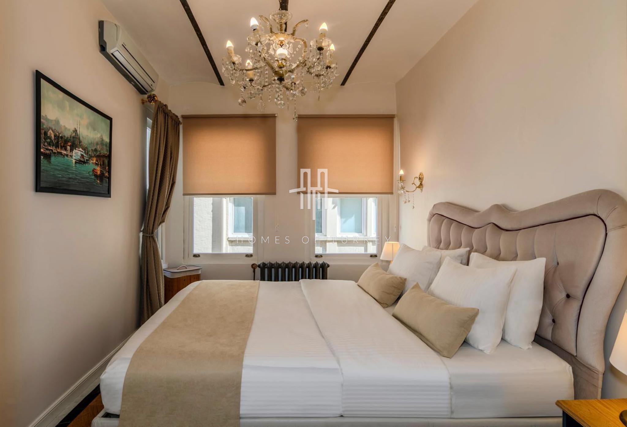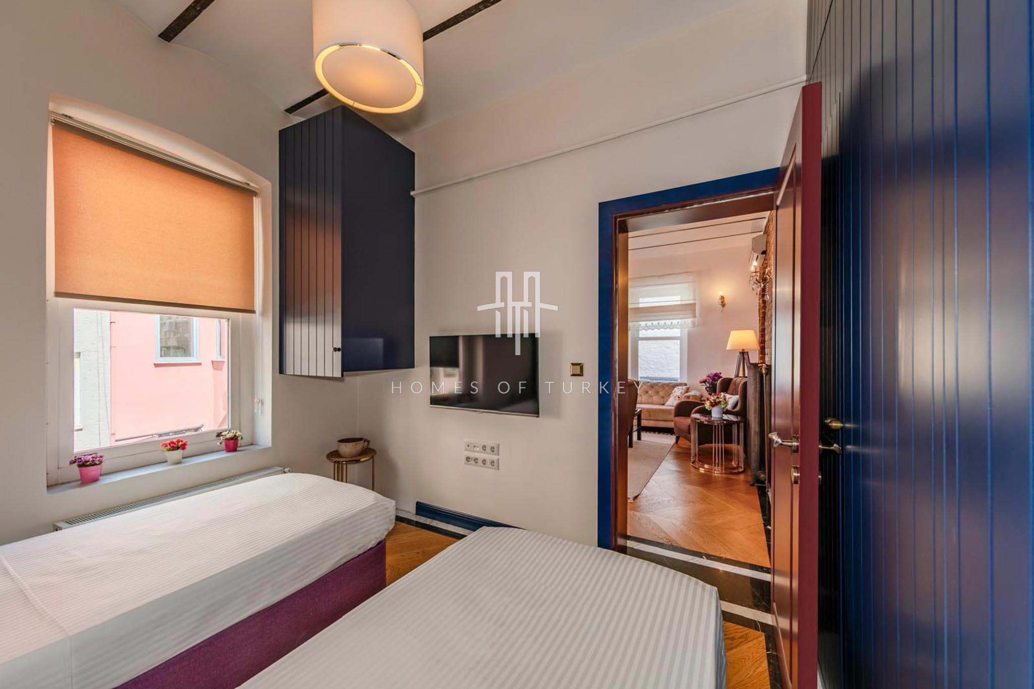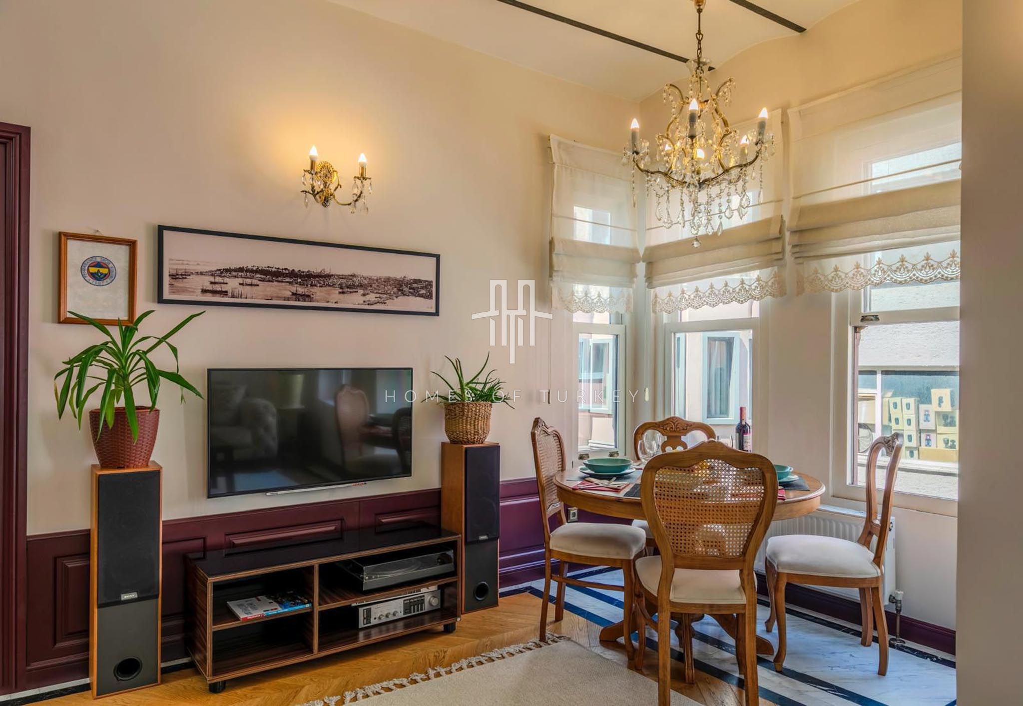 2+1 Apartment for sale in a historic building in Beyoğlu in Istanbul, suitable for citizenship and Airbnb applications. Located in the Galata district of Beyoğlu on the European side of Istanbul, Galata is the heart of the city, blending history with modern life. Its narrow stone streets, breathtaking views, and proximity to the iconic Galata Tower make it a rare location offering both residential and investment opportunities. This neighborhood in Beyoğlu is a vibrant center surrounded by modern living spaces in restored historic buildings, cafes, boutique shops, cultural venues, and restaurants, radiating life at every turn. Its proximity to the Golden Horn and the Bosphorus provides excellent city connections, with easy access to public transport, İstiklal Street, and Taksim Square. Galata’s architecture blends its deep-rooted historical fabric from the Genoese period with modern trends, offering a prestigious living atmosphere, and properties in the area have long-term appreciation potential.